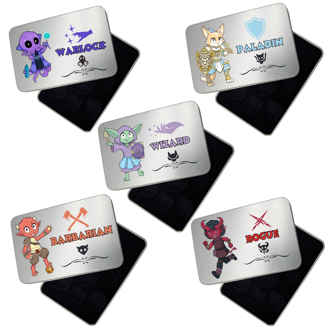 Class themed character dice Tins, comes with full set of mystery acrylic dice from our range.